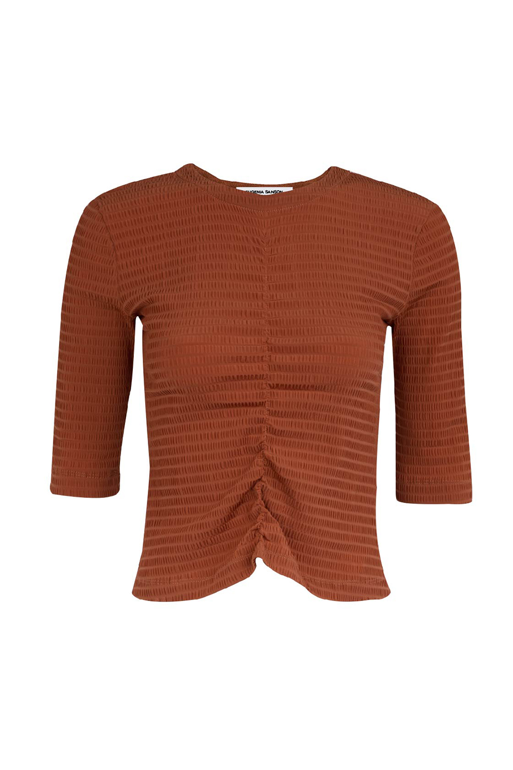 Descrição da peça: Blusa manga três/quartos, decote fechado, em malha franzida, com detalhe franzido no meio frontal partindo da barra.